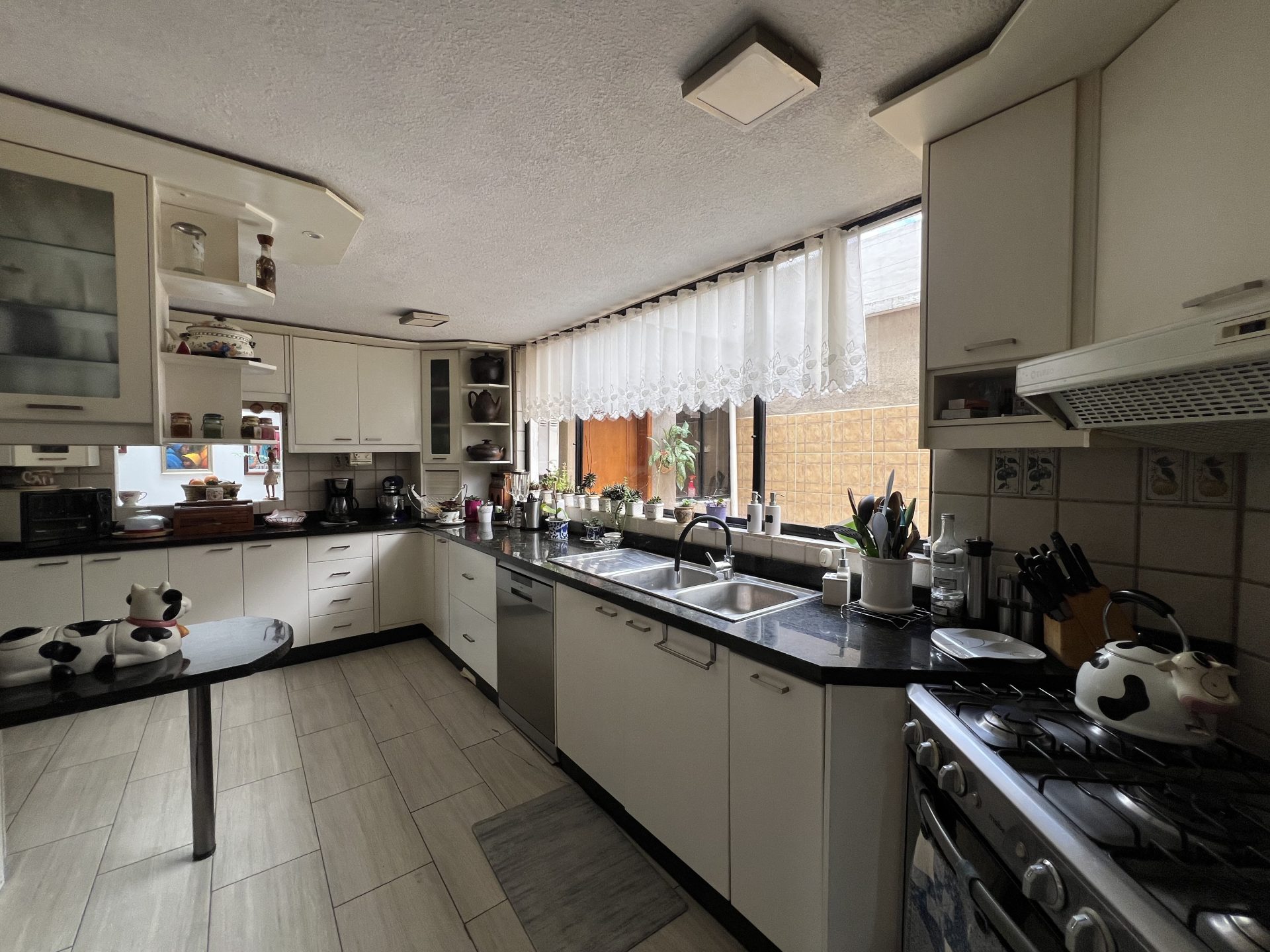 Cocina amplia con desayunador y doble acceso (desde comedor y recibidor)