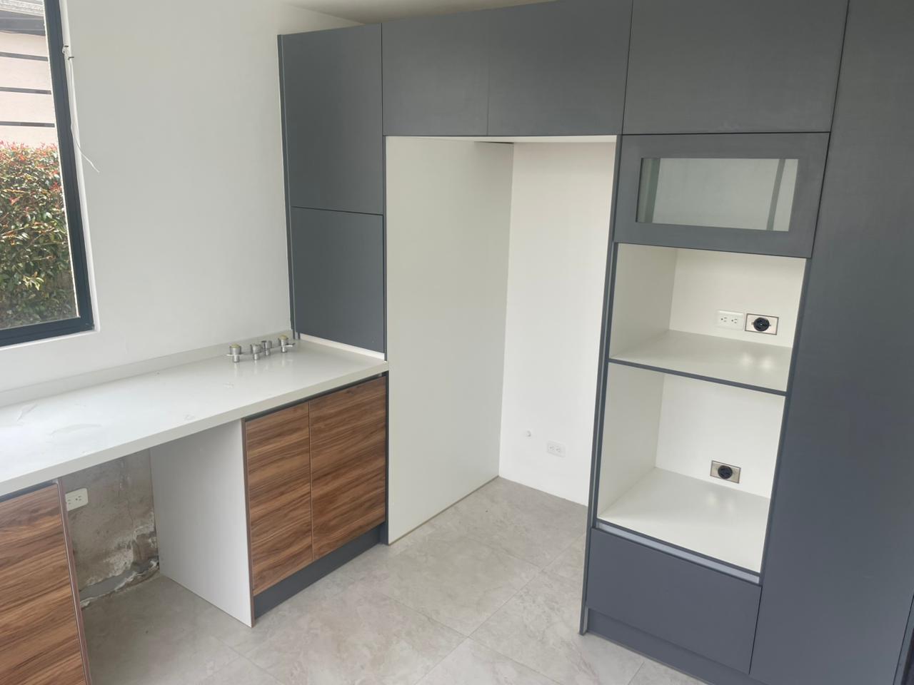 – Cocina cerrada equipada con muebles altos y bajos modernos