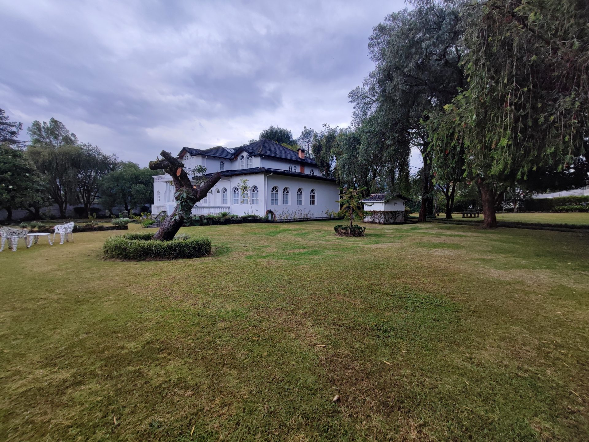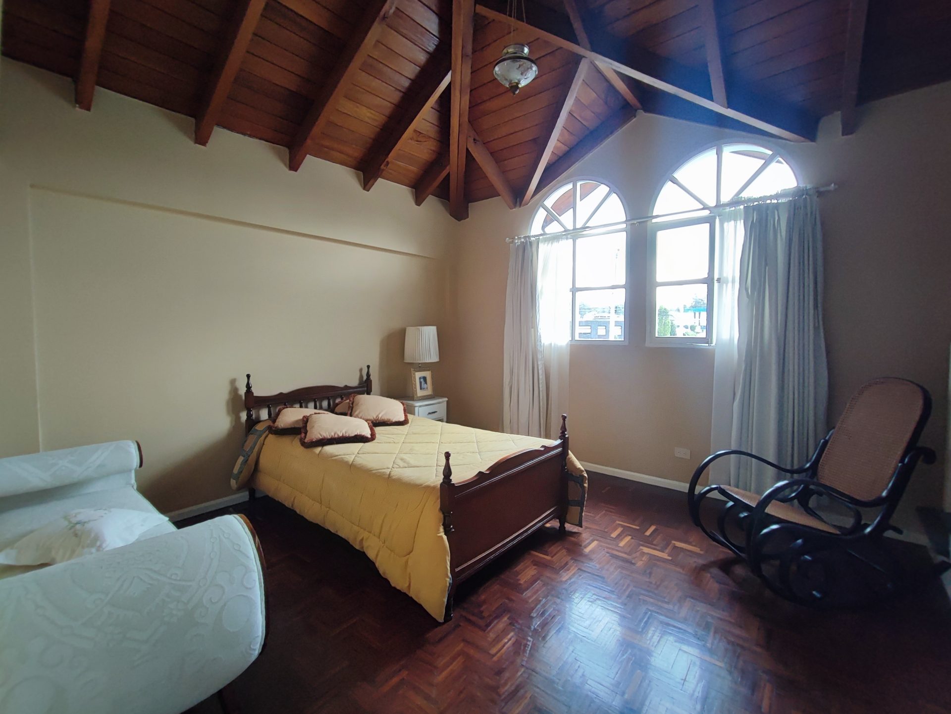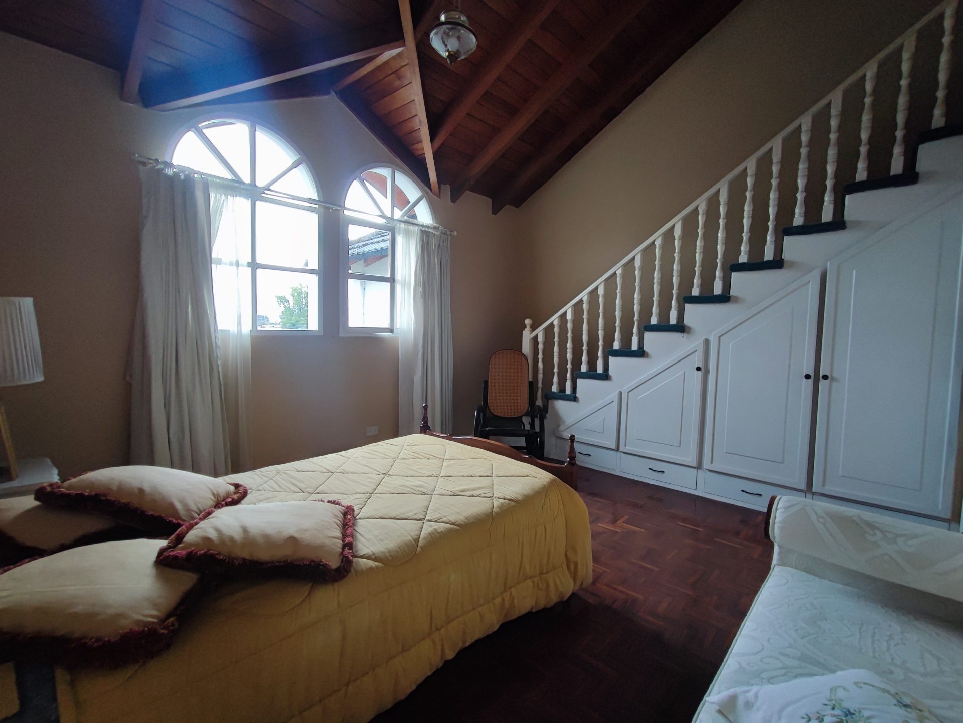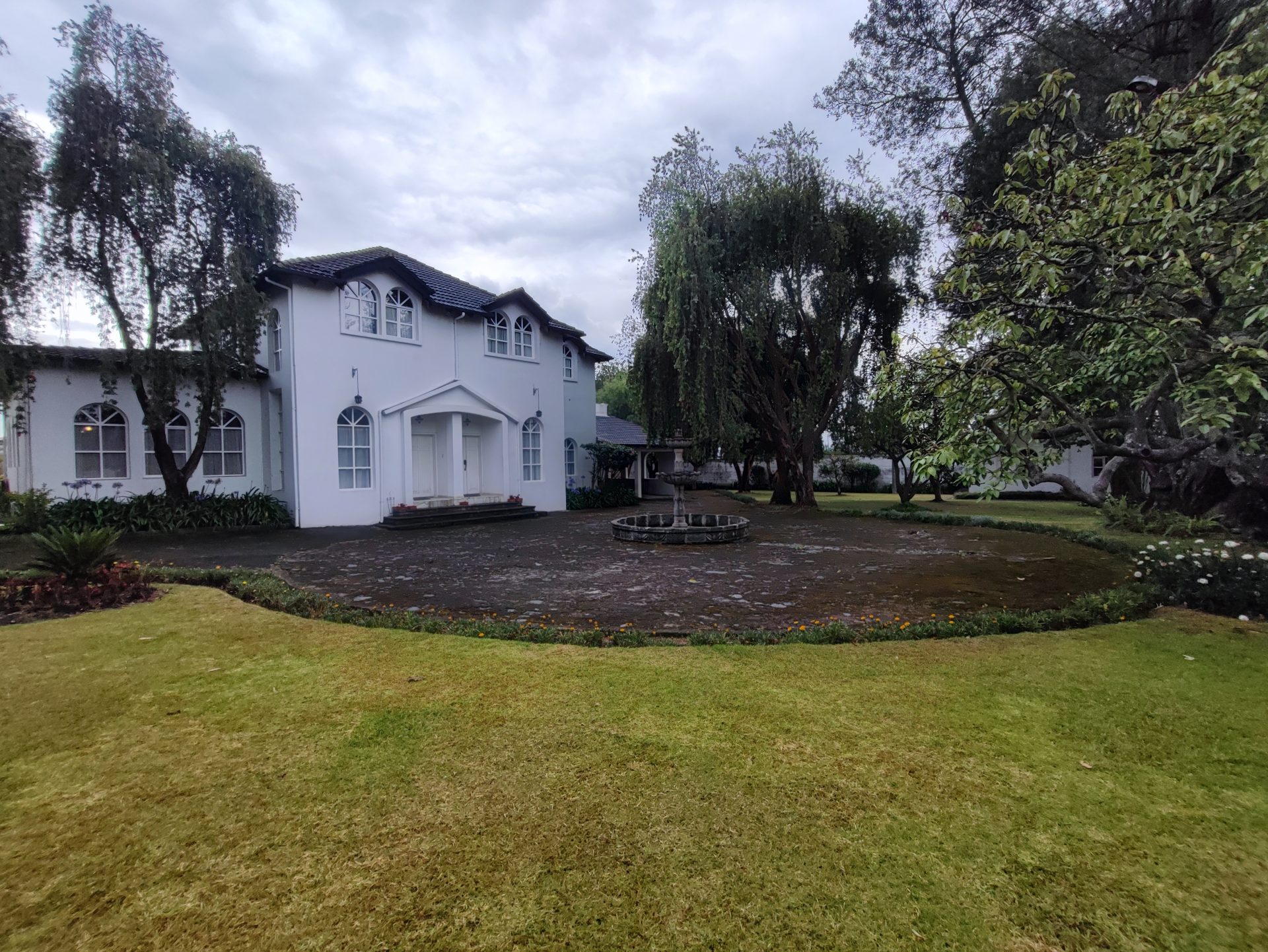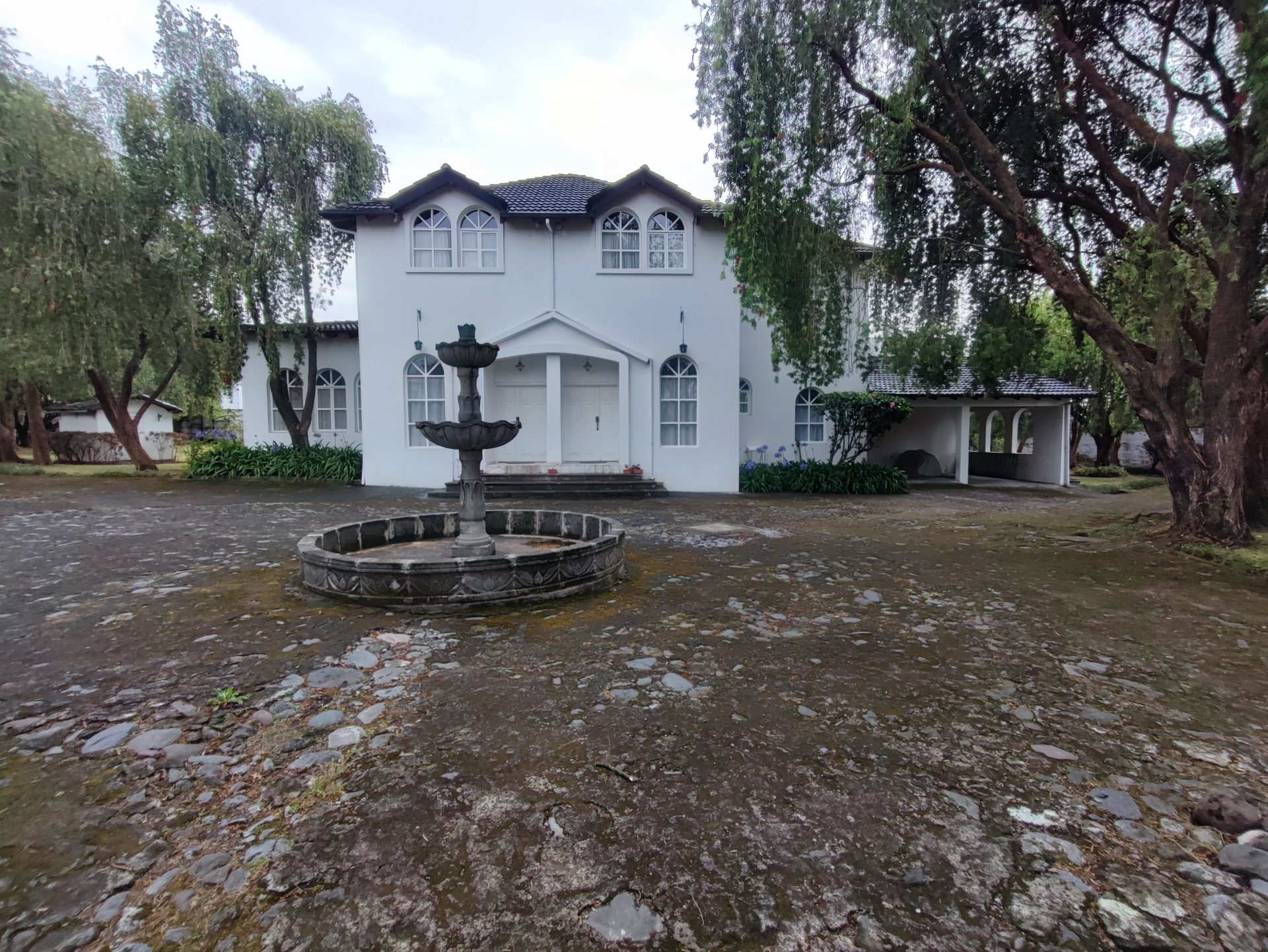 Casa de estilo clásico con detalles coloniales, rodeada de amplios jardines y con una arquitectura que combina elegancia y calidez. Sus grandes ventanales arqueados, el balcón frontal y la simetría de su diseño crean un ambiente encantador y atemporal.