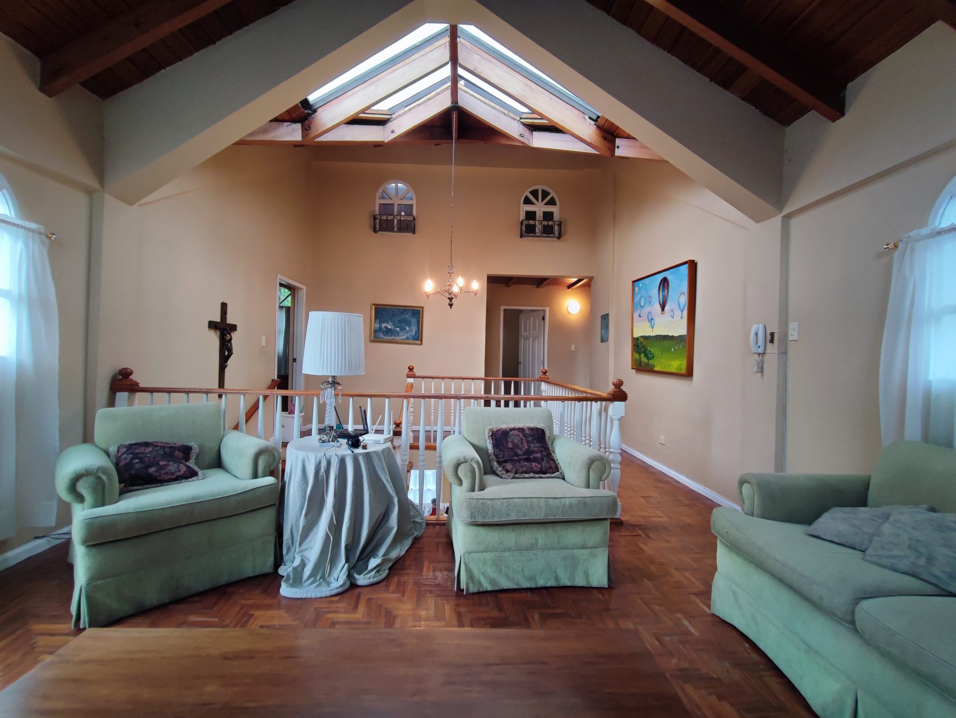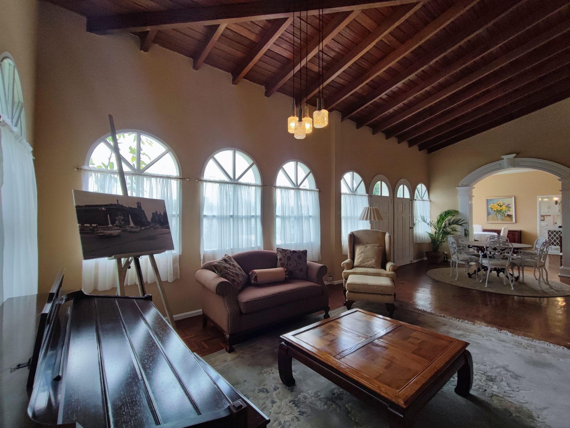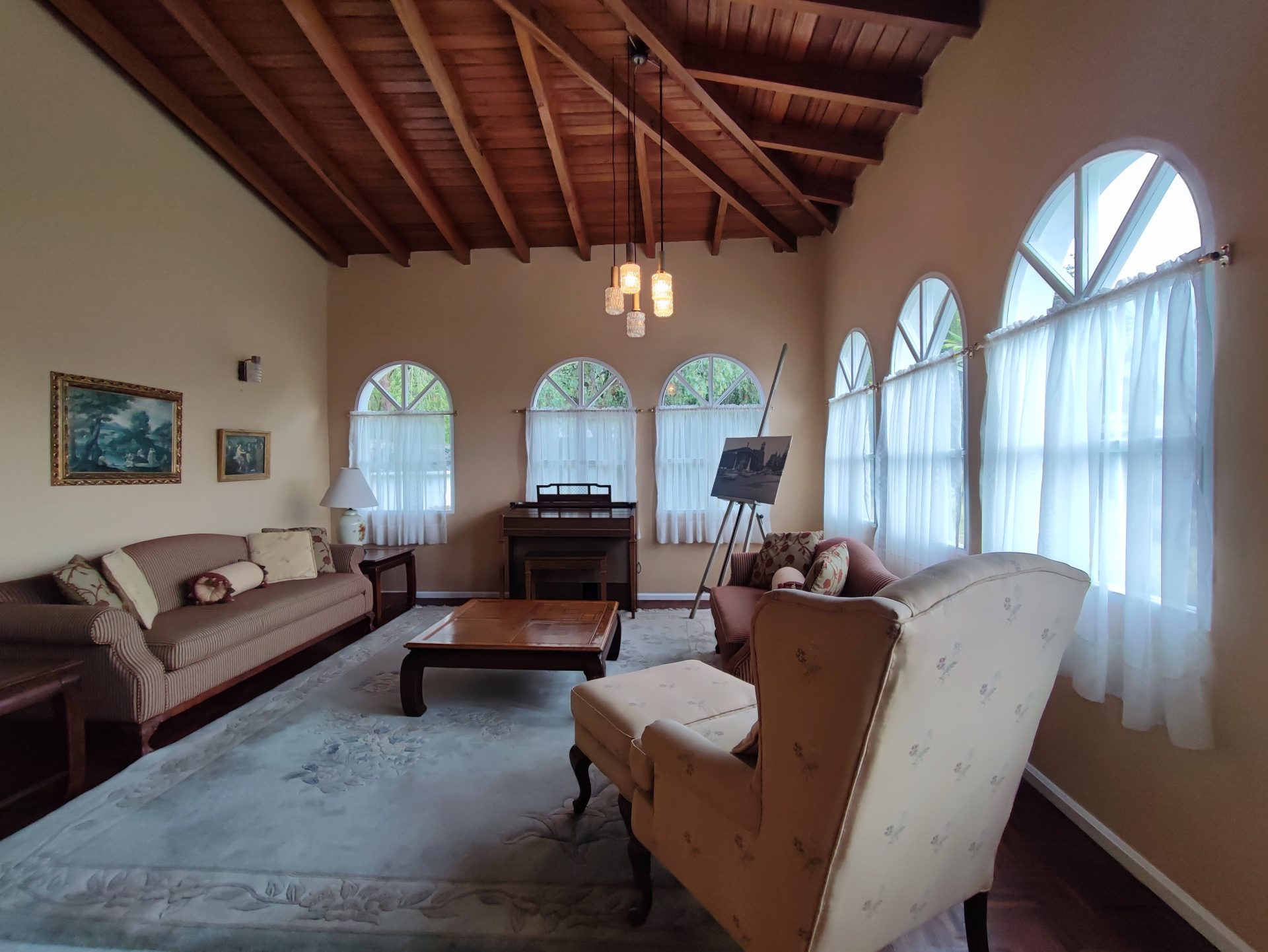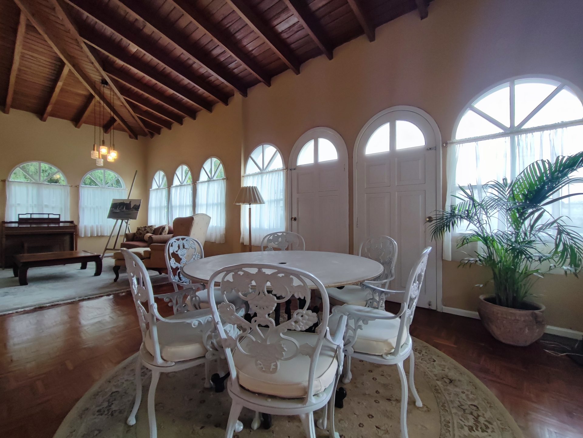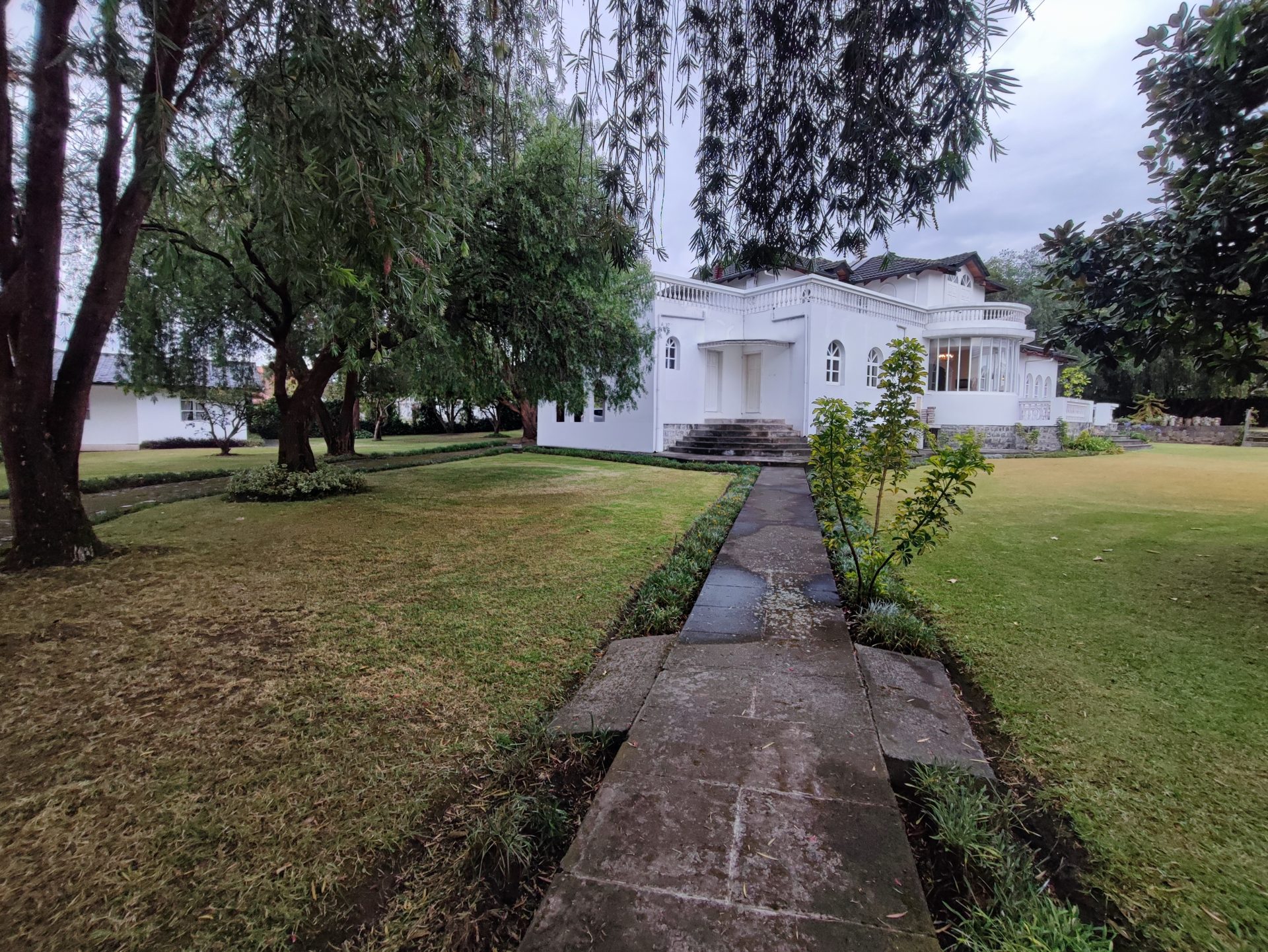 Casa de estilo clásico con detalles coloniales, rodeada de amplios jardines y con una arquitectura que combina elegancia y calidez. Sus grandes ventanales arqueados, el balcón frontal y la simetría de su diseño crean un ambiente encantador y atemporal.