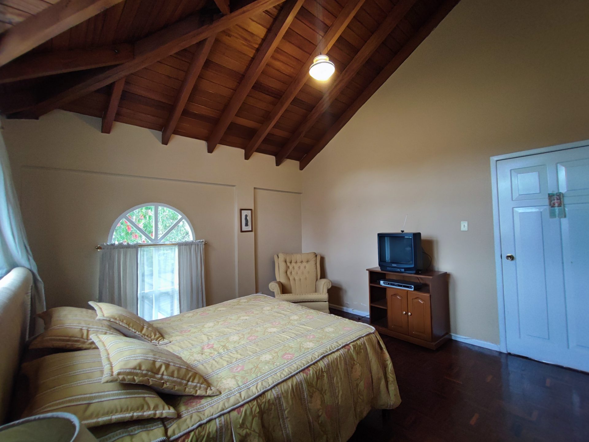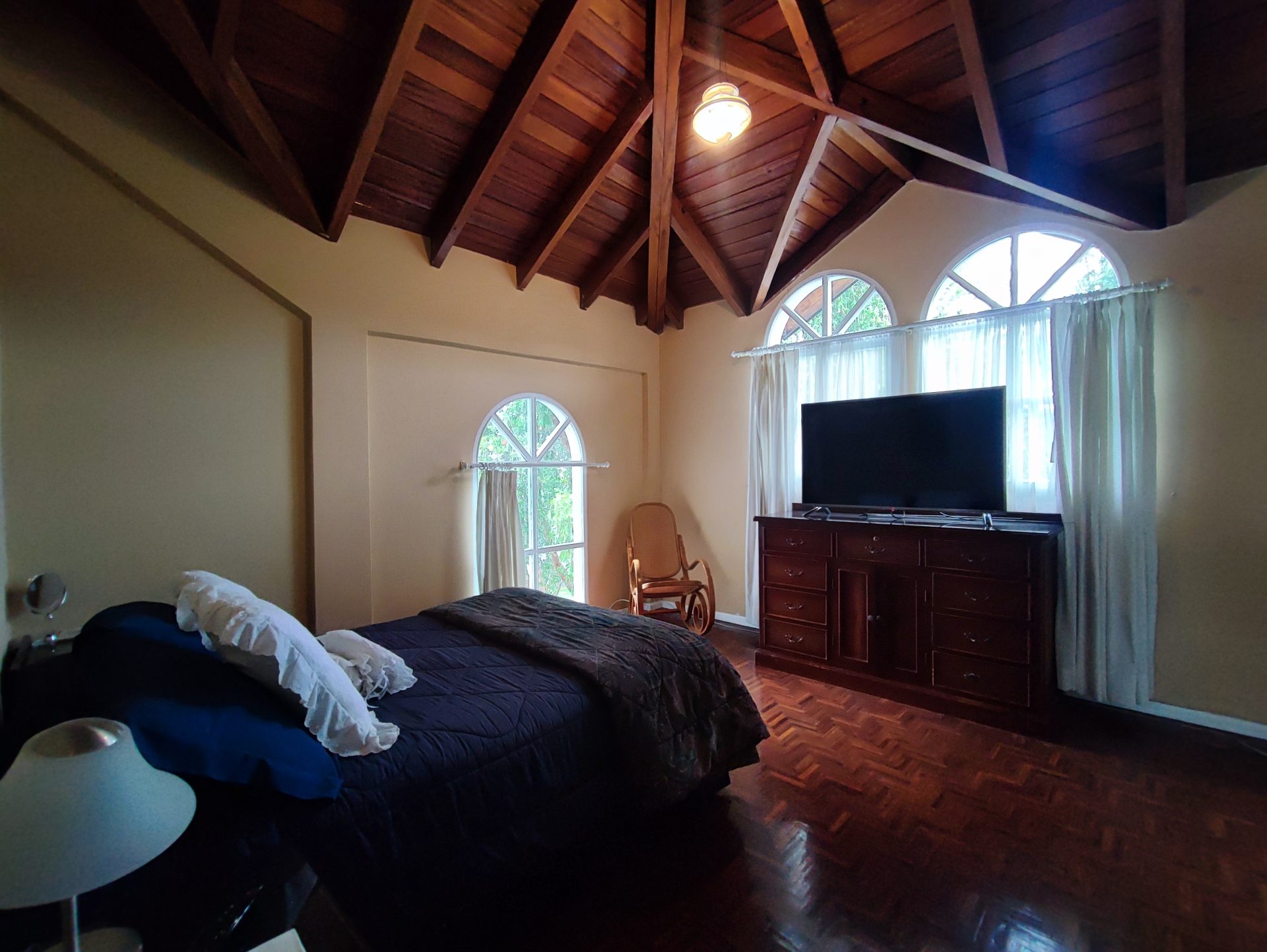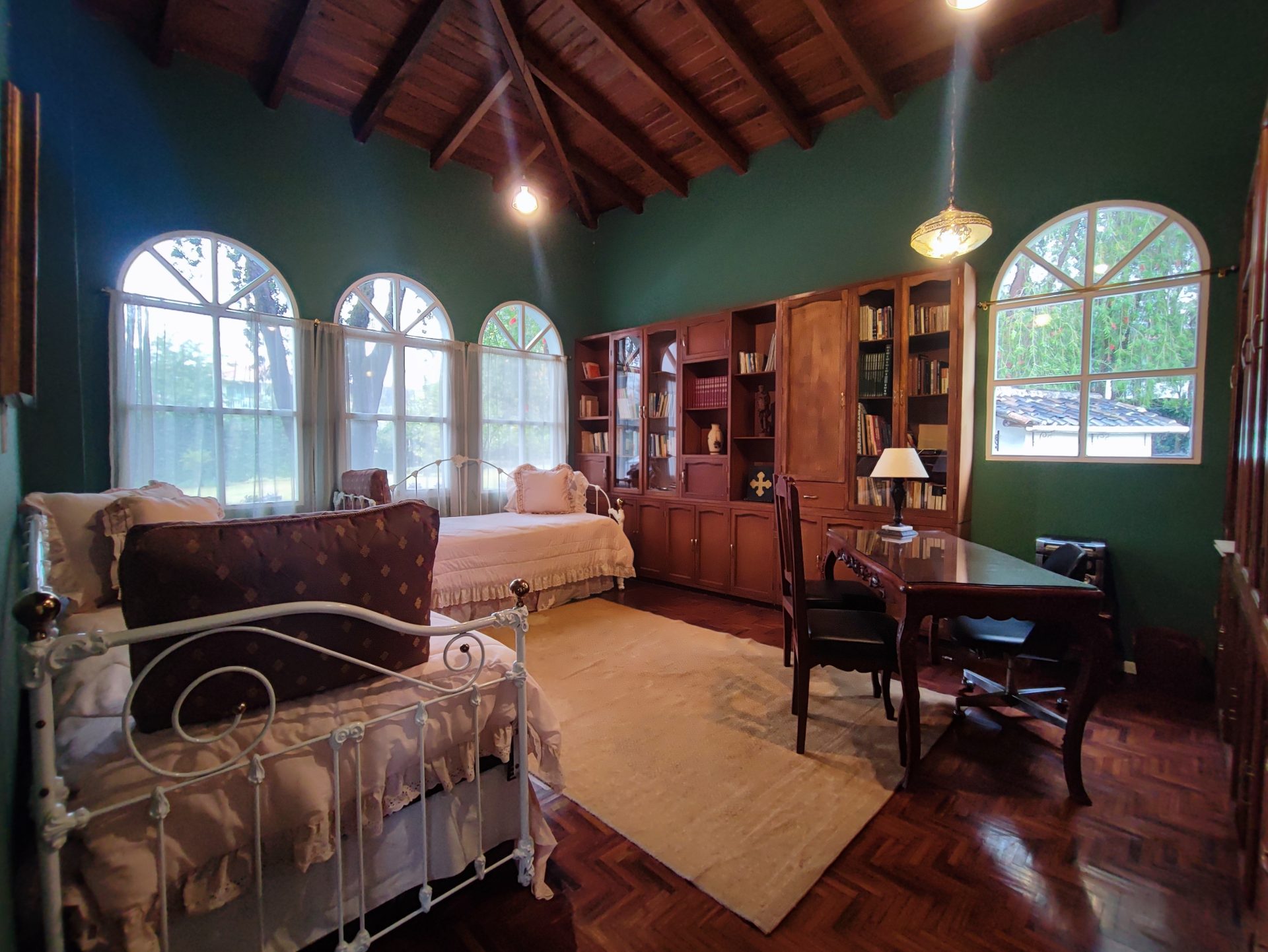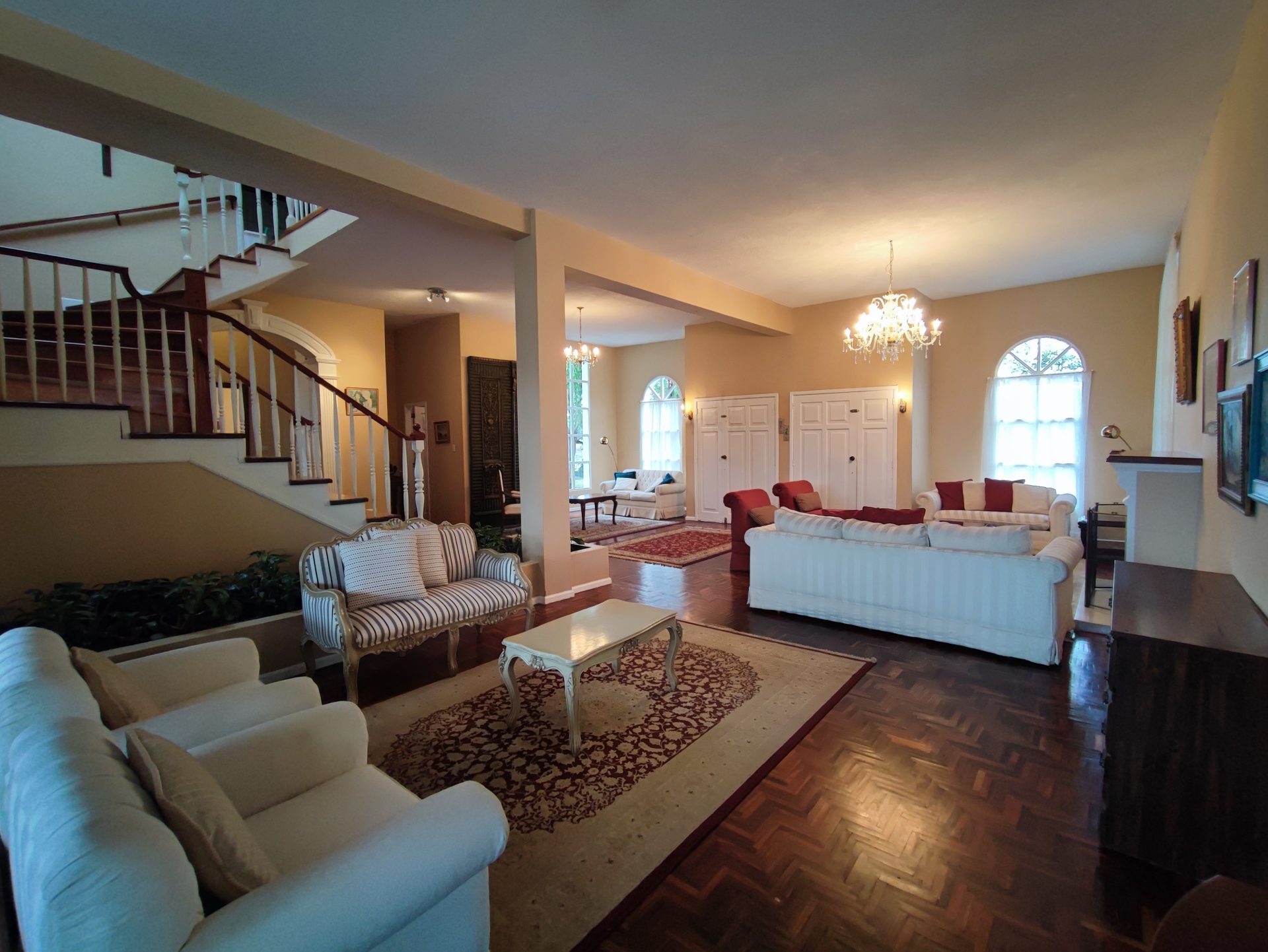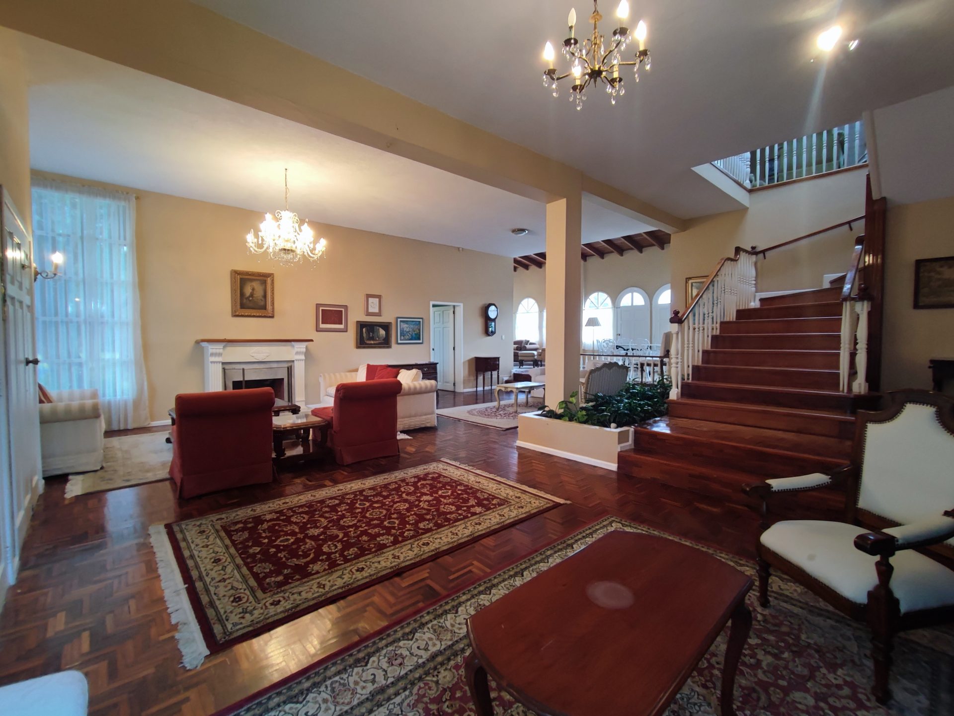 Casa de estilo clásico con detalles coloniales, rodeada de amplios jardines y con una arquitectura que combina elegancia y calidez. Sus grandes ventanales arqueados, el balcón frontal y la simetría de su diseño crean un ambiente encantador y atemporal.