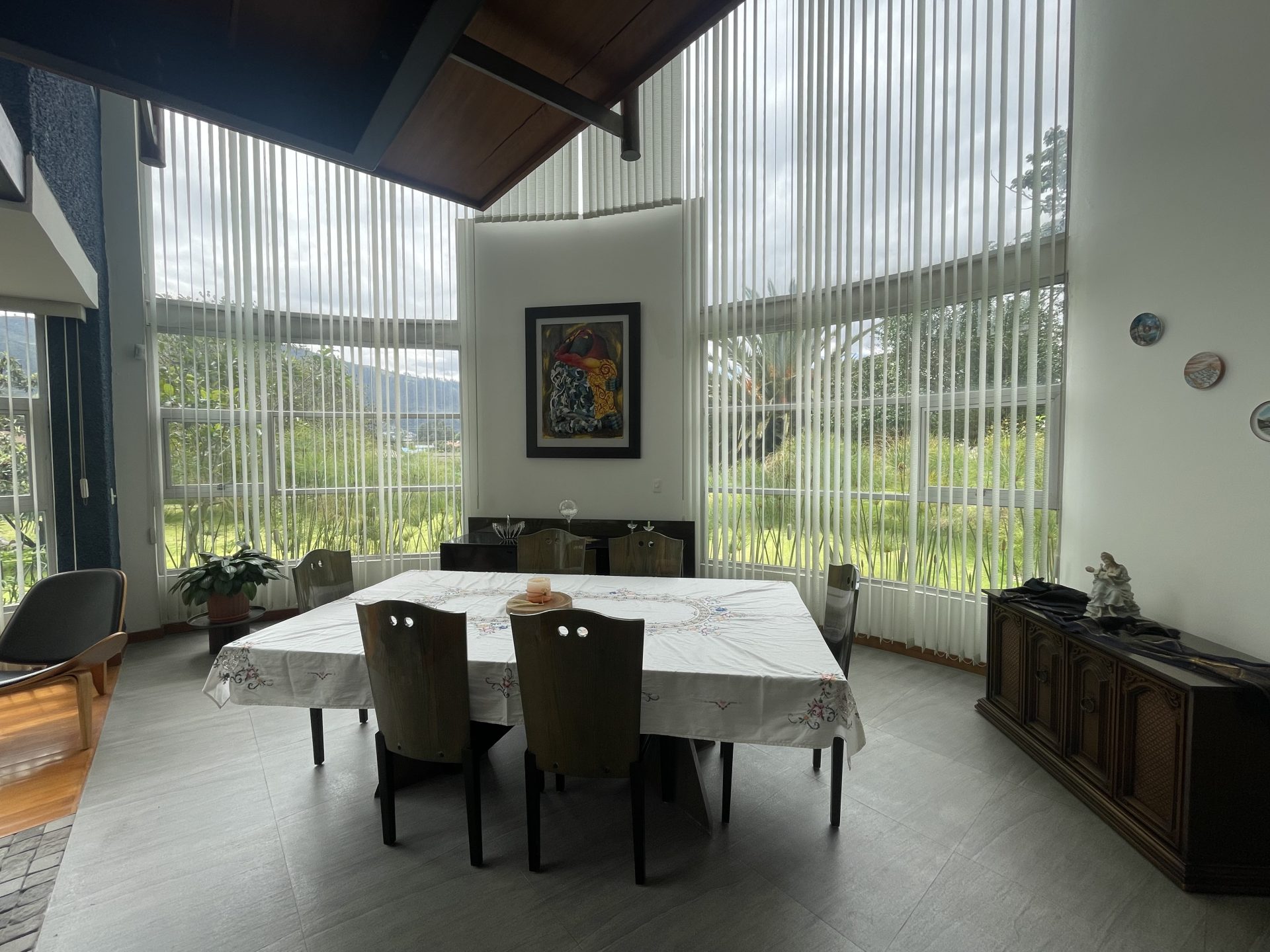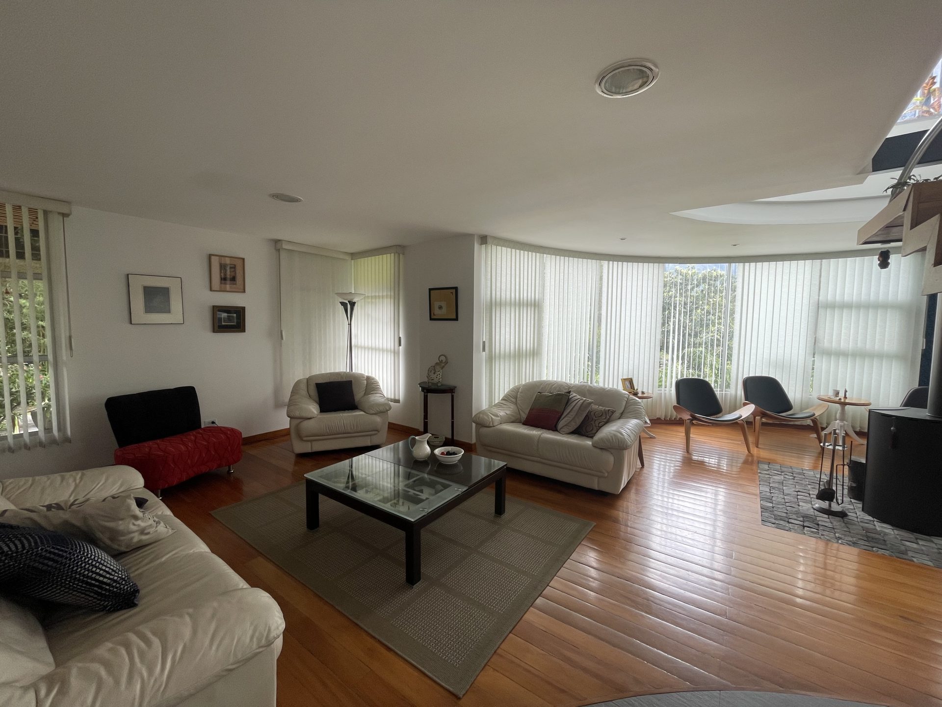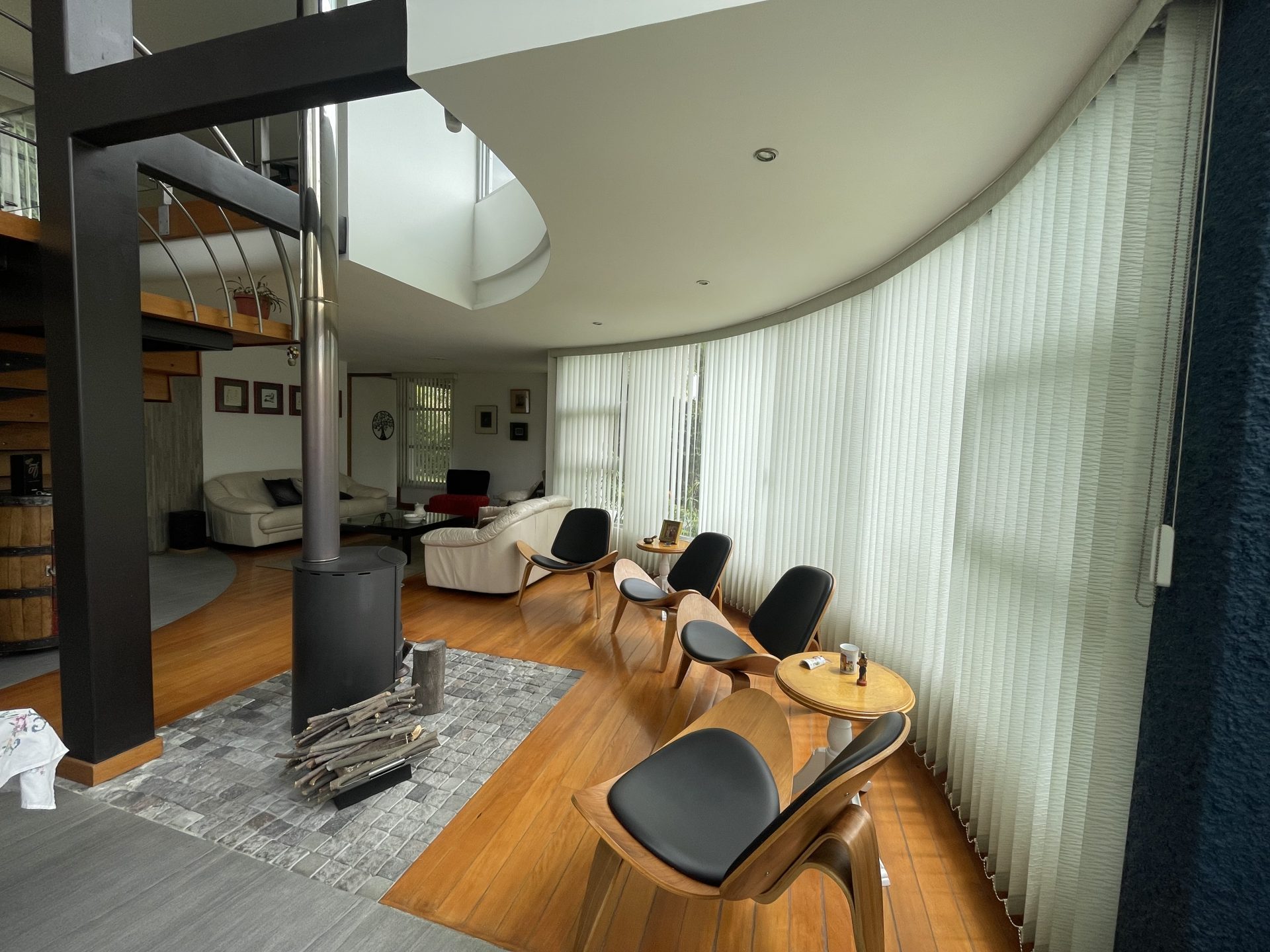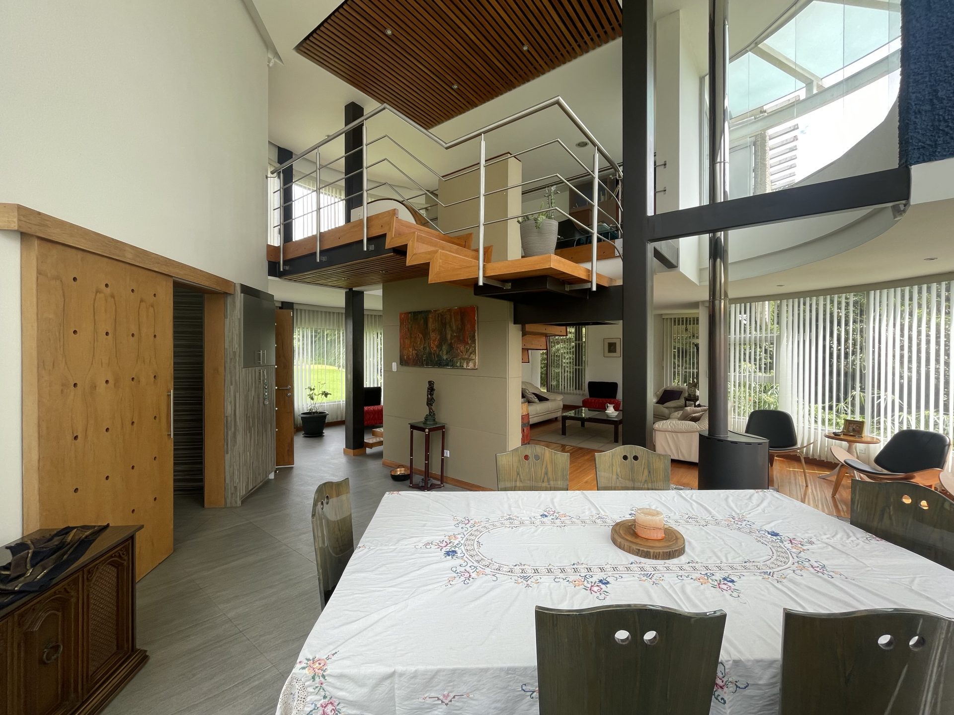 – Sala, comedor y sala de estar integradas con chimenea